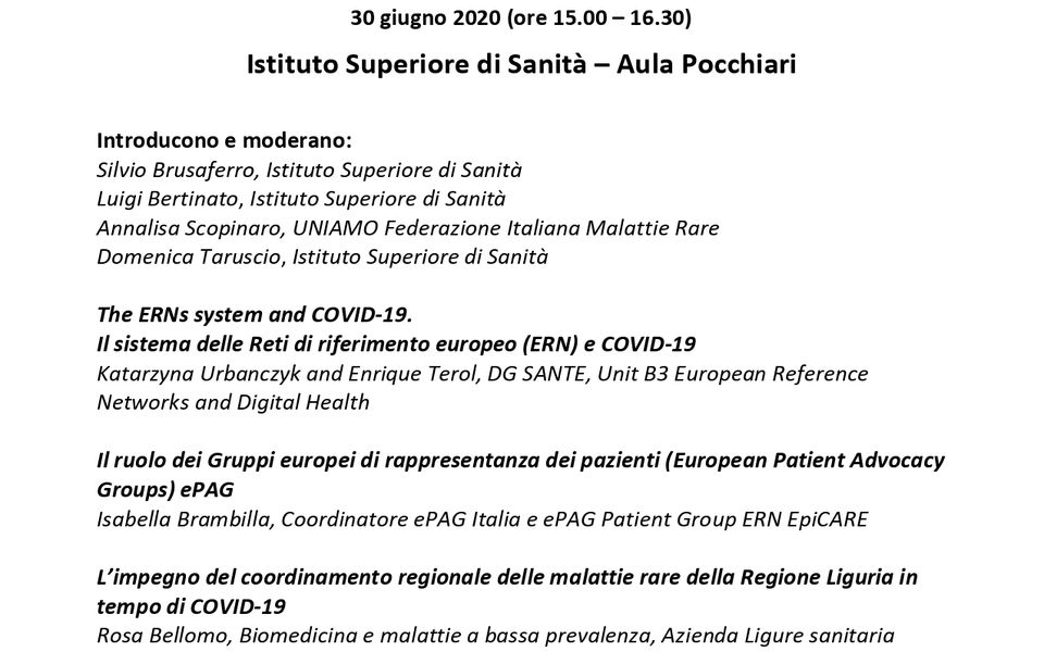 Martedì 30 giugno, dalle ore 15.00 alle 16.30, si terrà il decimo Webinar ISS del Gruppo di lavoro Covid 19 – #malattierare.